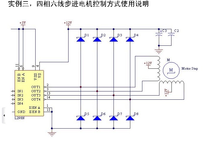電路不完整,8個二極管應該是起續流作用的,也就起保護L298n芯片。2/3線和對應繞組沒有標號。