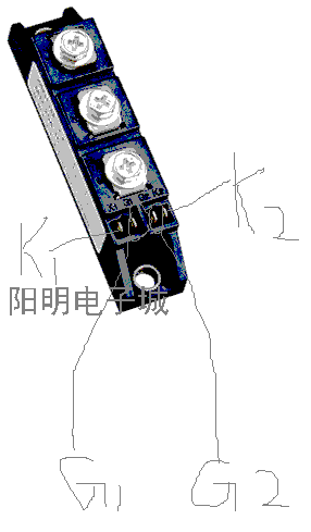 這是一個由兩個單向大功率可控硅并聯的模塊,K1、K2是和輸出端直通的,G1、G2分別是兩個可控硅的控制極,變頻器的主電源回路部分用的較多,主要作用是防止變頻器上點瞬間過電流引起空開跳閘,有些變頻器是用接觸器代替這一部份。