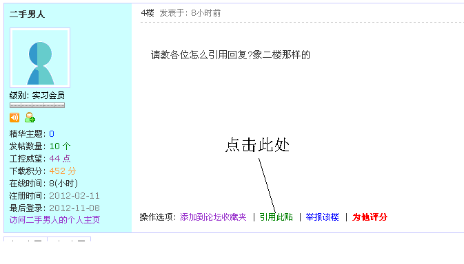 引用引用第4樓二手男人于2012-11-08 11:54發(fā)表的 :請(qǐng)教各位怎么引用回復(fù)?象二樓那樣的