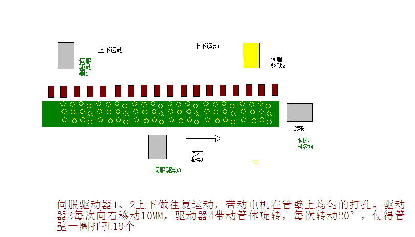 有個(gè)項(xiàng)目,是在一個(gè)直徑為50CM的管壁上均勻的打孔,打孔采用20個(gè)變頻器電機(jī),其他的采用4個(gè)伺服電機(jī),上面兩個(gè)伺服電機(jī)同步升降,帶動(dòng)變頻器打孔,最右面的每次旋轉(zhuǎn)一定的角度,使得管壁一圈均勻打孔,下面的伺服電機(jī)打孔時(shí)向右移動(dòng)30MM,使得多次移動(dòng)打完長(zhǎng)度為5米的管子,本來打算采用數(shù)控系統(tǒng),感覺有點(diǎn)大材小用,而且價(jià)格昂貴,想采用PLC加定位模塊,不知道是否可行,大家給個(gè)建議,怎么控制簡(jiǎn)單而又實(shí)用。簡(jiǎn)單畫了示意圖