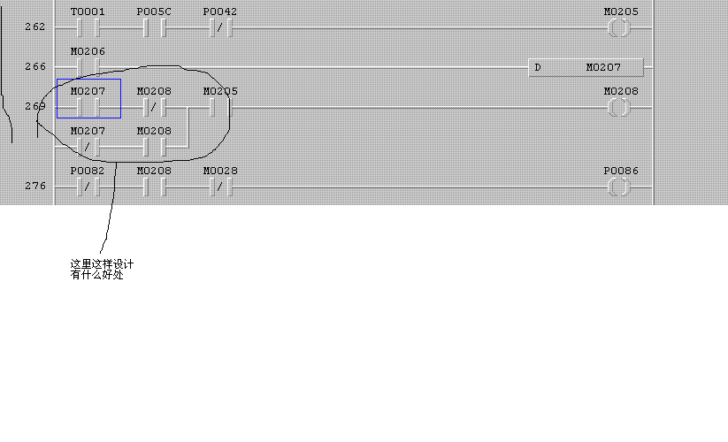 這是一個外部觸點啟動的程序,M206是觸摸屏的啟動按鈕,按鈕是復歸型的,狀態讀取M208。