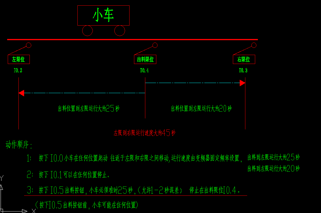 你的思路是對的,關鍵25秒難控制,有6個方向。最關鍵的按出料按鈕后不能停,小車的料要堆積出來,25秒到出料限位才行。