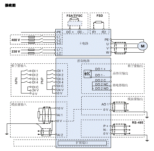 通過變頻器內參數調整,可以對DI1--DI4端口進行設置,分別為正反轉及固定頻率,接線圖如下圖所示