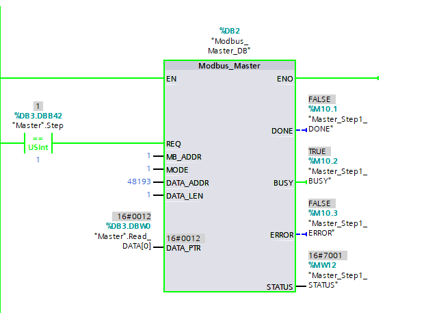 主站命令Modbus_Master的使能EN和REQ應(yīng)為同一觸點(diǎn),REQ還應(yīng)加沿信號。