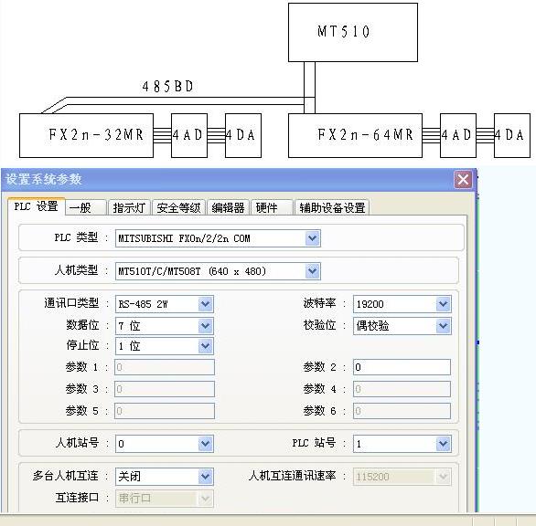 如圖所示:我用人機(jī)連接兩臺FX2n PLC,參考手冊我采用兩種方式:
