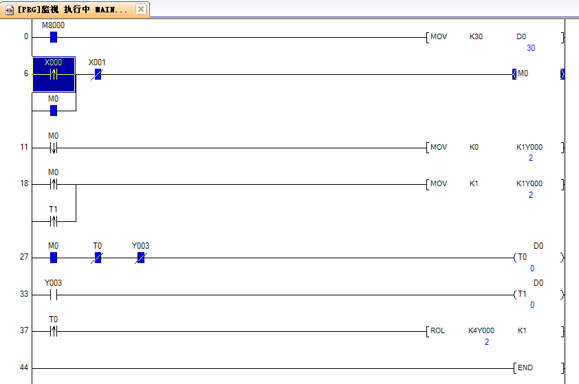 使用循環移位指令,移位到Y3(系統4只彩燈)時返回,D0設定亮燈時間。