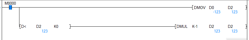 FX3系列我還真沒發現有絕對值運算指令,可以這樣假設要對D0里存有數值進行絕對運算后放到D1里