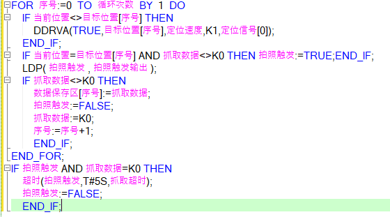 伺服絕對位程序, 移動(dòng)到A 點(diǎn) 觸發(fā)一次相機(jī) 然后自動(dòng)運(yùn)行到B 點(diǎn)再次觸發(fā)相機(jī)抓取數(shù)據(jù)保存到PLC的寄存器里面 這樣重復(fù)一共要 跑9 個(gè)點(diǎn) 然后抓取,想請問這樣的控制程序,應(yīng)該怎么來寫?我現(xiàn)在用的寄存器賦值,每次定位到了以后標(biāo)記位INC+1 然后跳轉(zhuǎn)到相機(jī)SOCKET程序段進(jìn)行抓取,抓取完成后通過計(jì)時(shí)器T1復(fù)位 賦值定位位置 繼續(xù)跑 這樣輪詢 還有別的什么方法么???