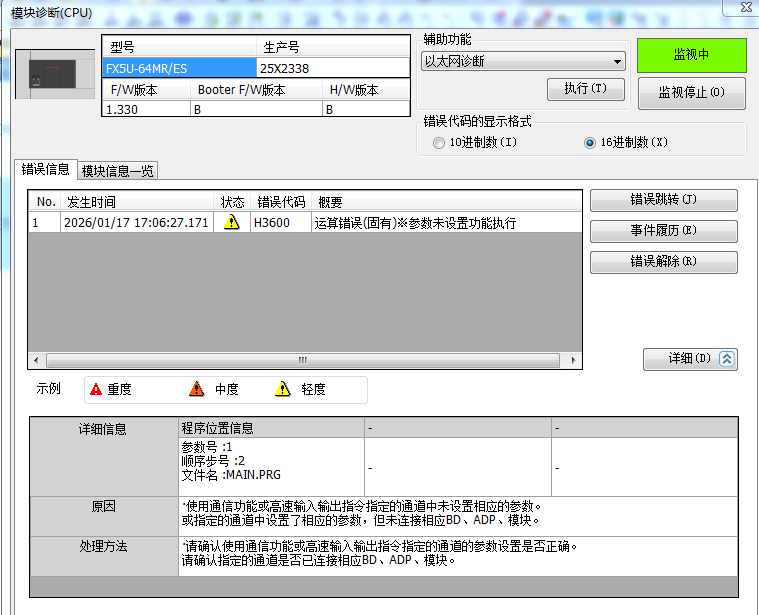 FX3u的程序轉換到FX5U,在FX5U報錯H3600,使用了SPD指令。參數設置:脈沖寬度設置打開使用,輸入信號響應時間0.6ms