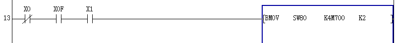 引用引用第2樓cuiyl于2008-11-07 09:05發(fā)表的 : 如果是BMOV SW80 K4M700 K2 意思就是傳送特殊連接繼電器sw80 開始 到 k4m700 =m700-m715 傳送位數(shù)k2=2個(gè)16位 結(jié)果就是從sw80開始到sw112的開和關(guān)也就是0.1數(shù)據(jù)映射到m700開始到m732上面。本人表達(dá)能力不行請多包涵!