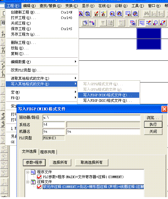 打開要轉換的程序,在gx developer程序,在"工程"------"寫入其它格式文件"-------"寫入FXGP(WIN)文件",彈窗,做好設置,執行OK。