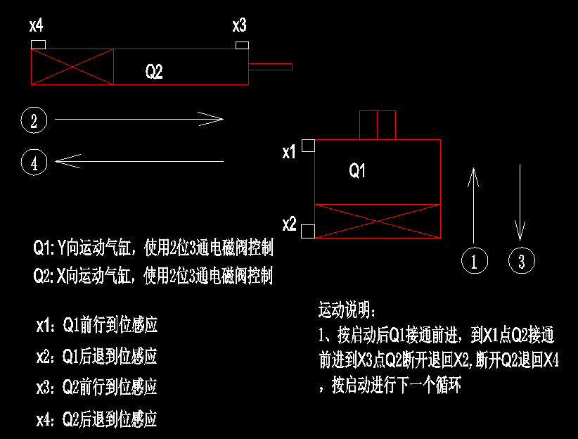 不好意思,運(yùn)動(dòng)說明的確寫錯(cuò)了一個(gè)數(shù)字,正確的應(yīng)該是:按啟動(dòng)后Q1接通前進(jìn),到X1點(diǎn)Q2接通前進(jìn)到X3點(diǎn)Q1斷開退回X2,斷開Q2退回X4,按啟動(dòng)進(jìn)行下一個(gè)循環(huán)。