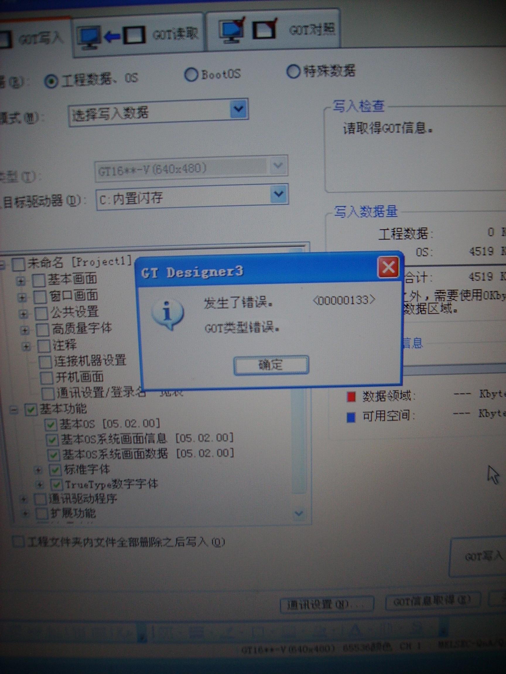 公司新買的GOOT,型號:GT1662-VNBA,可是下載基本畫面時,提示安裝基本0S,可在安裝基本OS時,GT3為何報"GOT類型錯誤"???