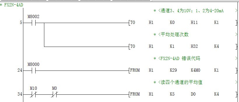 是FX2N-4AD模塊,這里的H32是指CH1,CH2,CH3,CH4在每一個掃描周期都在做A/D轉換。轉換32次求出他們的平均值放置于各個通道。至于32次用多少時間取決掃描周期的長短,也就是程序越多越慢。