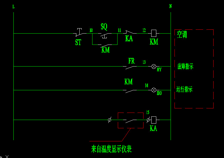 高溫報警觸點閉合。KA得電,斷開串在操作回路里的KA常閉觸點。空調就自動停止了。