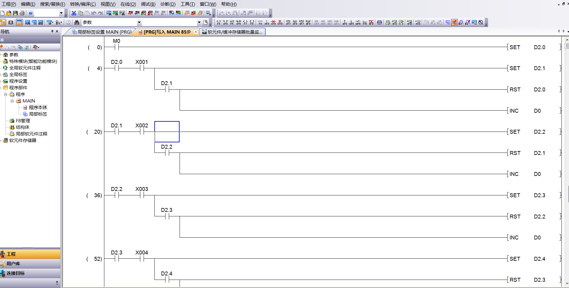 打個比方,CCD檢測到第一個箱子給D0賦值5,同時把D2.0置位,,前進感應到傳感器一,D1加1,(記得加條件只有D2.0置位的情況下觸發傳感器一才能對D1加1),同時把D2.0復位(這樣就不會后面箱子觸發傳感器D1再次加1啦),把D2.1置位;加條件D2.1置位的情況下觸發傳感器二才能對D1再次加1,同時把D2.1復位,D2.2置位。。。。。。。。就這樣第三個傳感器復位D2.2置位D2.3,D1=3啦。。。。。。。第四個傳感器復位D2.3置位D2.4,D1=4啦。。。。。。第五個傳感器復位D2.4,D1=D0=5啦,OK把箱子推出去,同時把D0D1D2都復位啊。第二個箱子D3D4D5跟在后面不會影響第一個箱子D0D1D2啦。。。。。