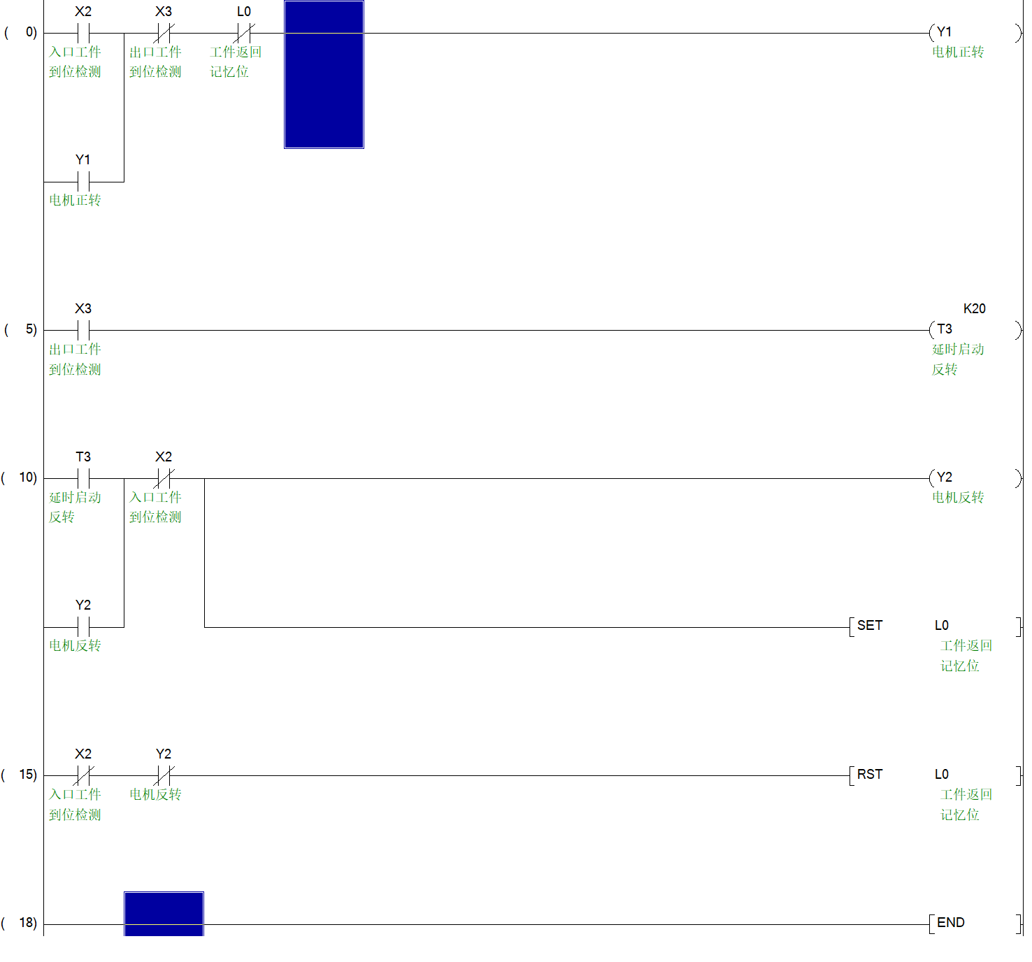 當中,入口處感應器,作為啟動條件,又作為反轉停止條件,如果運行中東西掉了,感應不到,就無法停止反轉了,要穩定可靠的工作,可能還要考慮限位、急停等條件。
