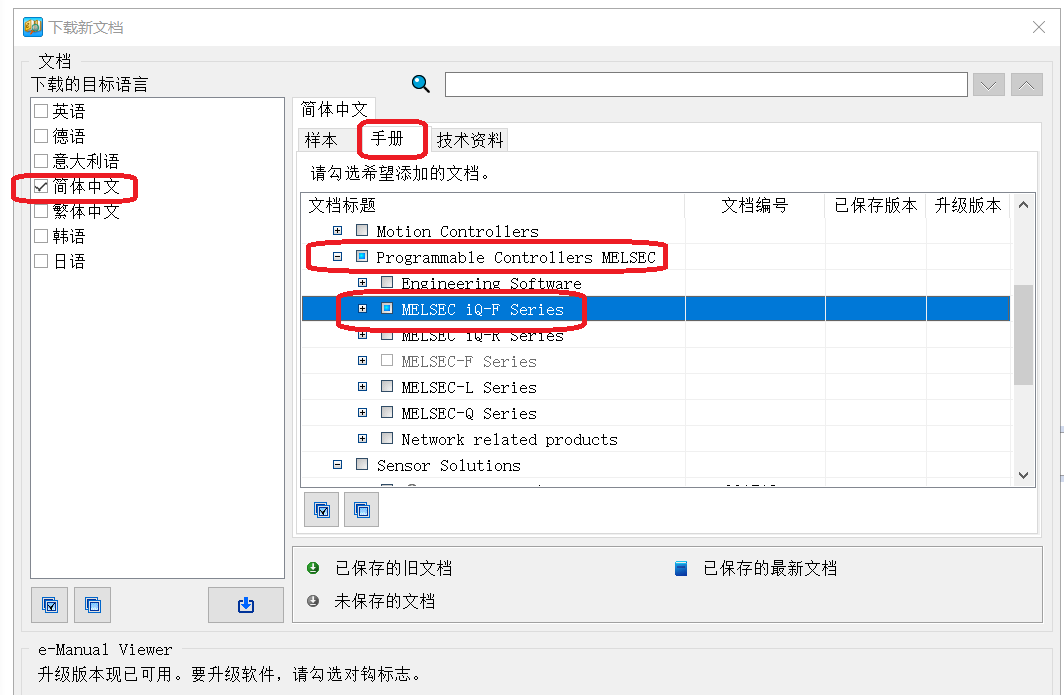 選擇時注意一下,左邊選“簡體中文”,右邊選擇“手冊” 下面的 “Programmable Controllers MELSEC”