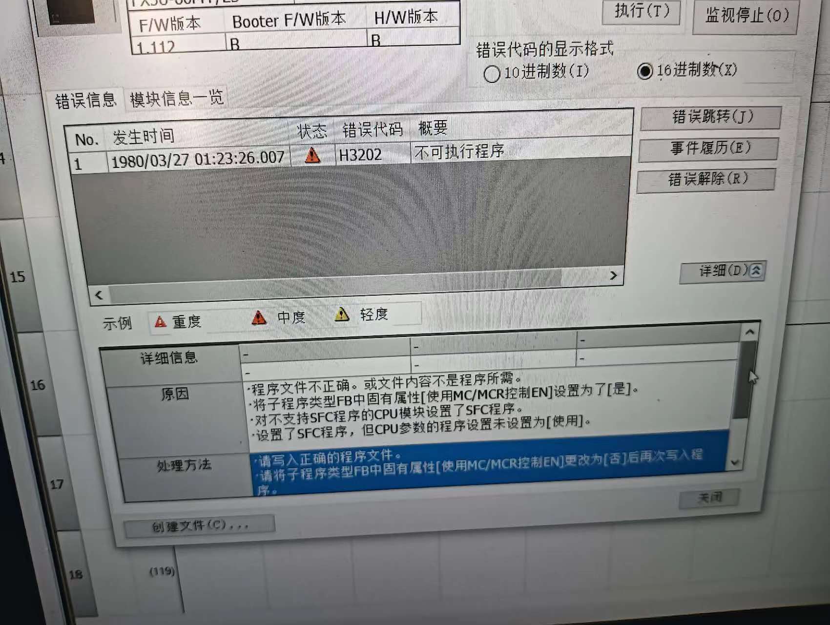 現(xiàn)場有一臺fx5u的plc.時不時就出現(xiàn)莫名其妙的停機。其他同事沒在意,以為是網(wǎng)線的問題,導(dǎo)致通訊不上。后來換幾次網(wǎng)線,還是出現(xiàn)問題。有一天出現(xiàn)了停機。就拿電腦過去監(jiān)控一下。經(jīng)過診斷,提示意思說不支持mc mcr功能,看功能塊也沒有調(diào)用sfc功能,后來打電話問下三菱技術(shù),最終確認(rèn)是固件版本低的問題。找采購聯(lián)系代理,代理發(fā)過來一個固件升級包。