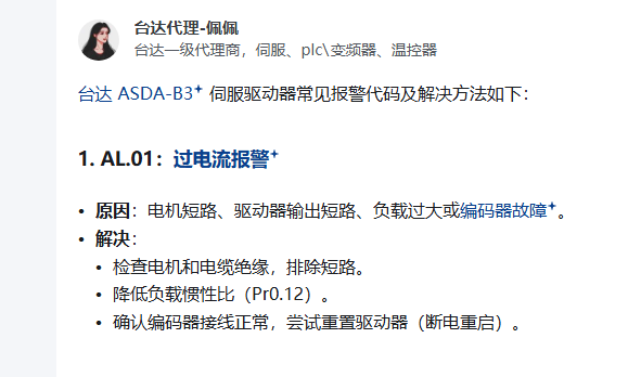 臺達伺服控制器控制一個軸水平運動。機器用了好幾年,近幾天,每天都有出現AL.001報警,查手冊,顯示過電流。目前沒有找到原因。檢查了線纜。聯軸器等,暫沒發現問題。望大佬指點思路對策。