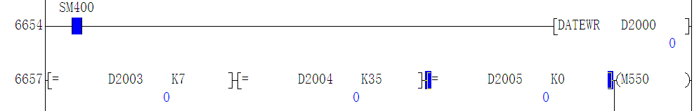 請問 下這段程序怎么在PLC當前時間7點鐘不能顯示出來D2003=7呢?是我程序寫錯了嗎,請高手指點下,謝謝!