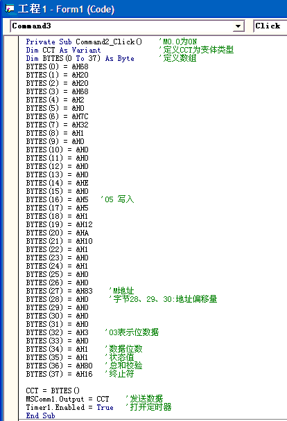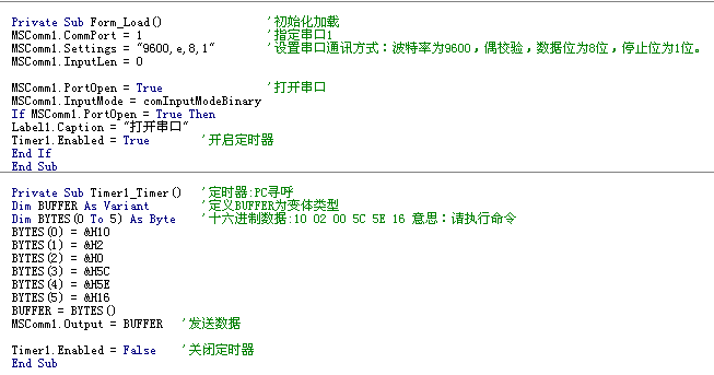 VB中用的控件有:兩個按鈕、兩個標簽Label、一個定時器timer、一個通訊控件MSComm1.