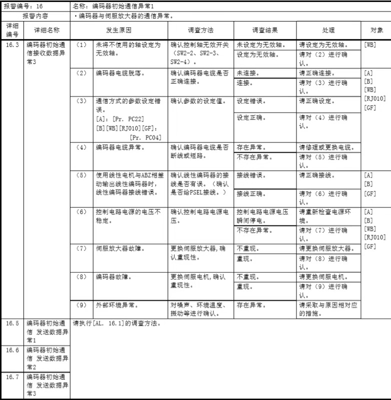 請問各位老師 我司有一臺三菱MR-J4-500B現在報70.3  --16.3故障,這是編碼器有問題嗎?而且已經重新換過一條新的編碼器線了一樣報這個故障,驅動器和電機都是剛買回來新的,一上電就報這個故障了、、、、新的東西不會這么快就壞了吧???