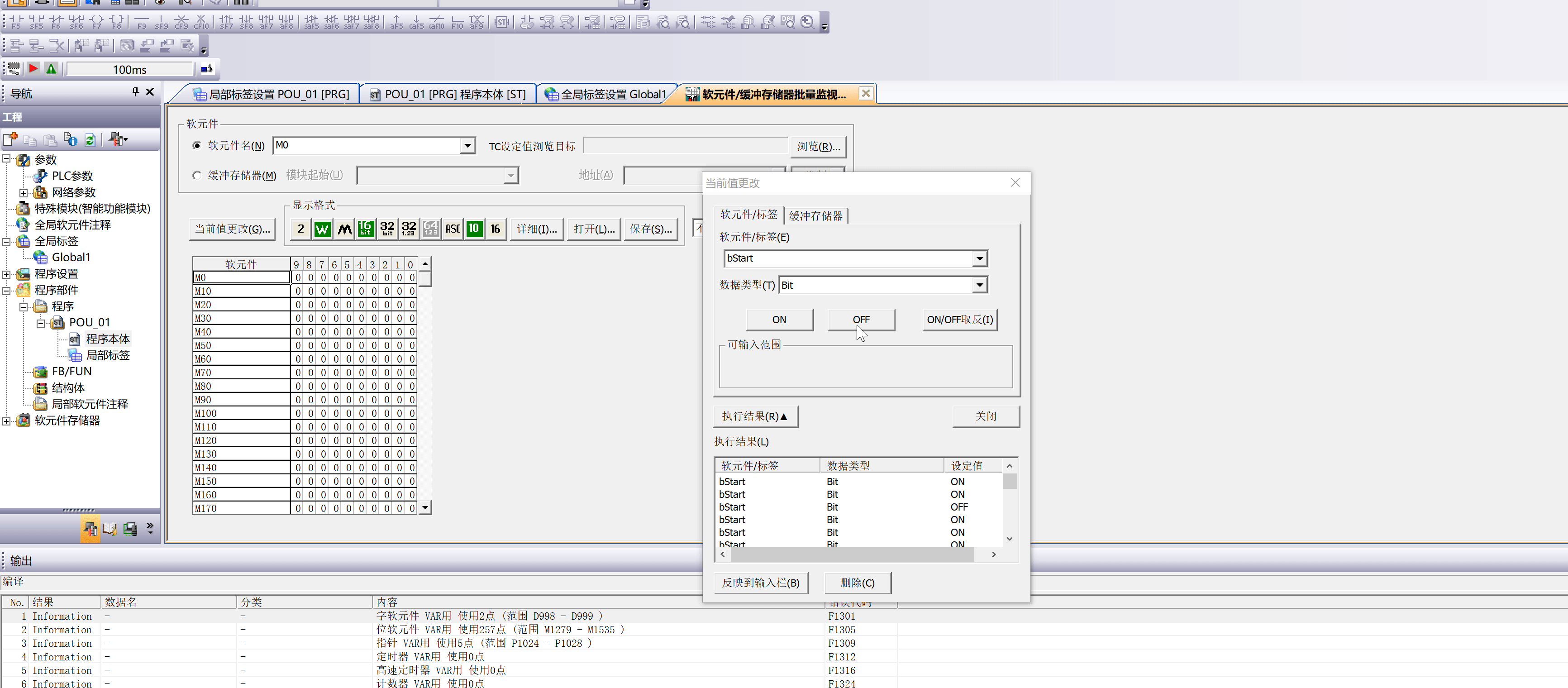 關于數組:在全局變量中聲明一個長度為256個的BOOL數組,關聯地址M0,通過X1上升沿,變動數組索引,再對變化后的數組索引位,進行置位操作;