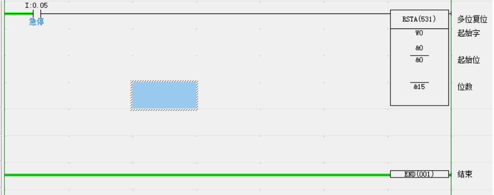 歐姆龍手冊上多位復位RSTA的用法,只針對輸入或輸出繼電器做了例子,要對內部繼電器進行多位復位,和手冊上的例程有點不一樣,D起始字指定W0,N1起始位設定&0,N2位數設定&15,即從內部繼電器W0的0.00開始往高位15個位數復位。