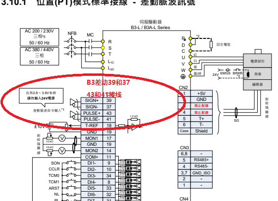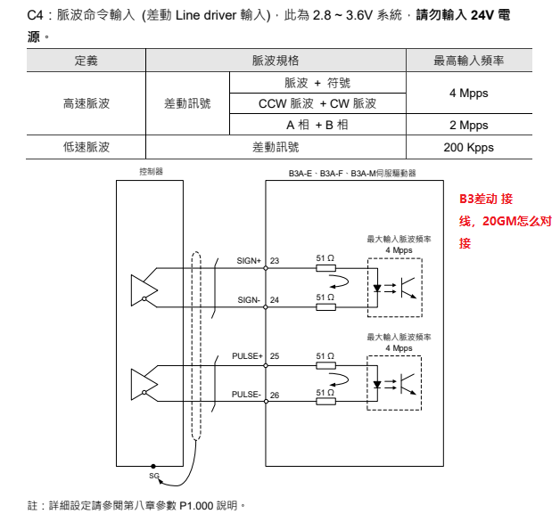 問題一 ;臺達B3有 AB相輸入差動輸入和脈沖+方向。不知B3差動輸入怎么和20GM接線(看了臺達脈沖形式和20GM不一樣)