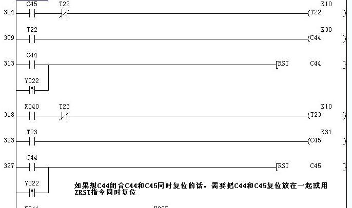 因為程序是自上而下掃描的,當程序掃描到327步的時候,C44已經復位(已經OFF),所以C45不能復位