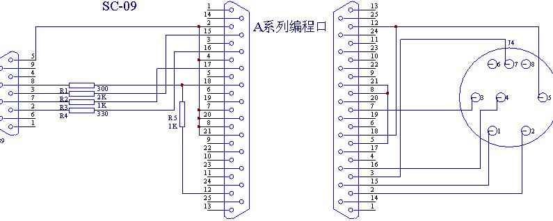 我用現(xiàn)成的RS232/RS422轉(zhuǎn)換器連接25針插頭做的SC-09, 就是把RS422的TXD+/TXD-接到2和15,RXD+/RXD-接到3和16,挺好用的,用在老的三菱PLC上,25針插頭直接用,后來(lái)的8針插頭實(shí)在找不到,買(mǎi)了一個(gè)連接電纜接到25針插頭上,現(xiàn)在一直用著。