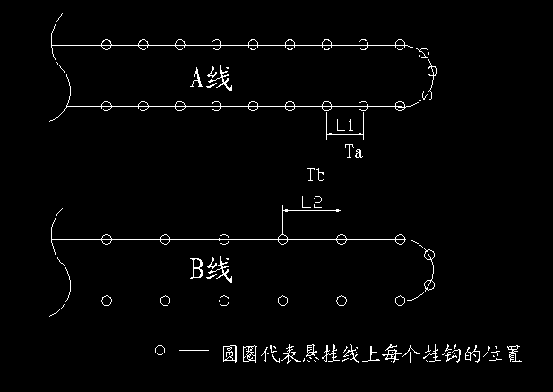 如圖, A線,B線分別代表兩條懸掛鏈線,分別由1臺變頻器+1個馬達帶動運行,每個圓圈代表掛鉤的位置,因為工藝要求,其中L1不等于L2。為了讓兩條懸掛鏈線運行時,每個圓圈代表的掛鉤走到下一掛鉤位置所需的時間Ta、Tb (簡稱步距時間)要一樣,需要A線變頻器與B線的變頻器的運行頻率不相等(分別用Fa與Fb表示),會成一定的比例關系(如Fa/Fb=K,K為常數)。